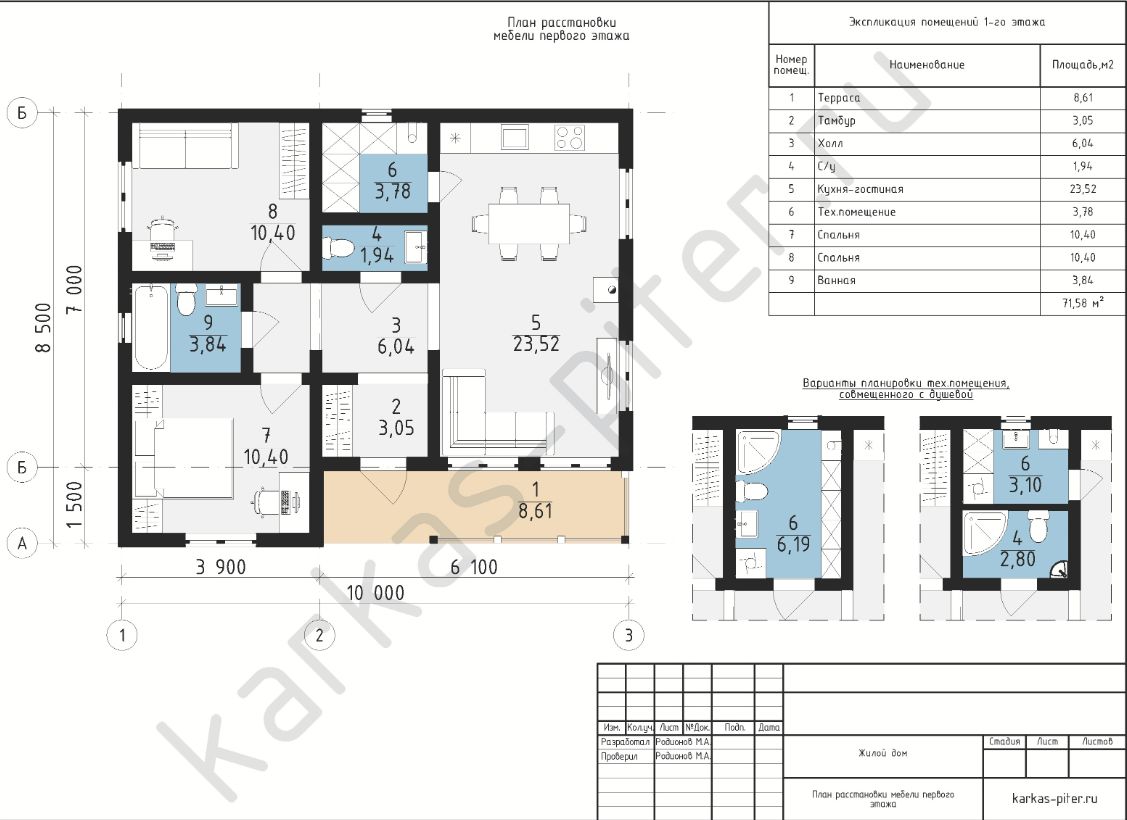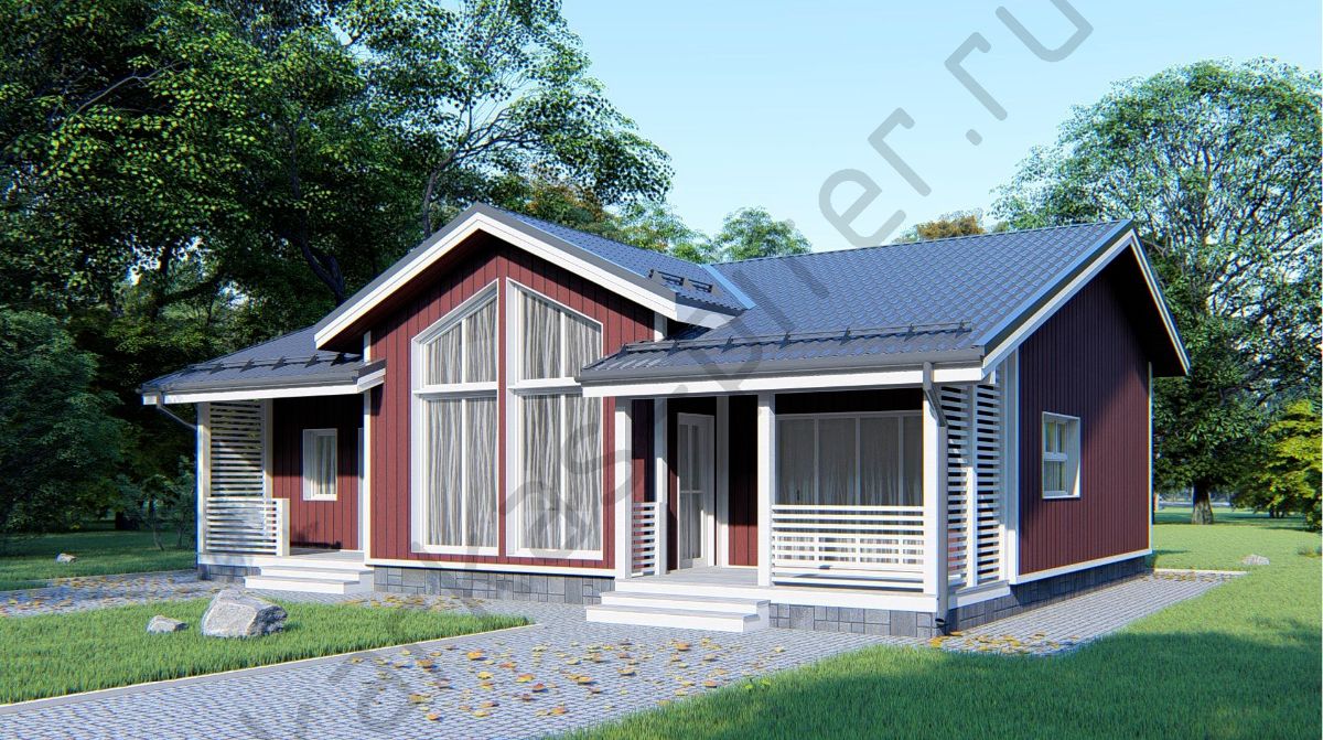 #КП_СОСНОВО_71 Размер - 8,5х10,0 м; Площадь помещений - 62 м2; Площадь террасы - 9 м2. |